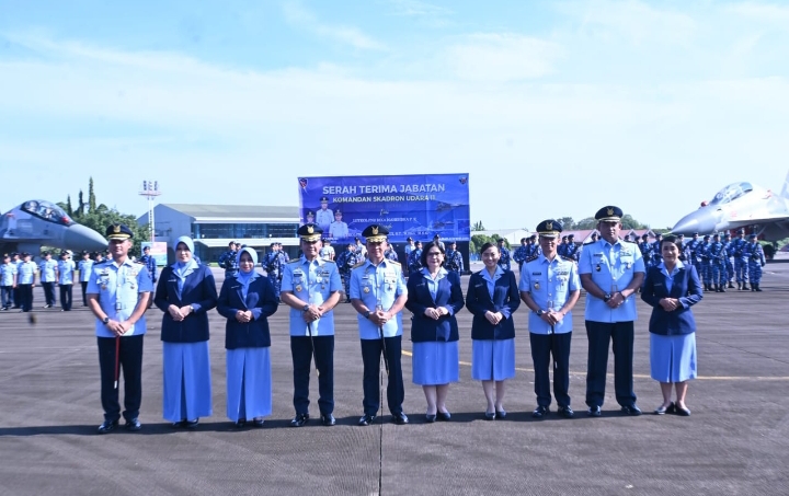 Makassar – Komandan Lanud Sultan Hasanuddin Marsma TNI Arifaini Nur Dwiyanto, M.Han., didampingi Ketua PIA Ardhya Garini Cabang 2/D.II Lanud Sultan Hasanuddin Ny. Betty Arifaini Nur Dwiyanto, menghadiri Serah Terima Jabatan (Sertijab) Komandan Skadron Udara 11 yang dilaksanakan di Apron Shelter Skadron Udara 11, Makassar, Jumat (27/3/2026).