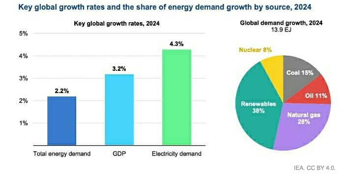 IEA menyatakan bahwa percepatan ini dipicu oleh sektor kelistrikan. Pada 2024, konsumsi listrik global melonjak 4,3%, dengan sebagian besar peningkatan dipenuhi oleh sumber energi rendah emisi.
