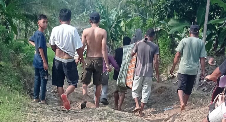 Dalam kejadian tersebut, warga sekitar terpaksa bergotong royong membawa pasien menggunakan tandu sederhana melewati jalur ekstrem yang tidak layak dilalui.