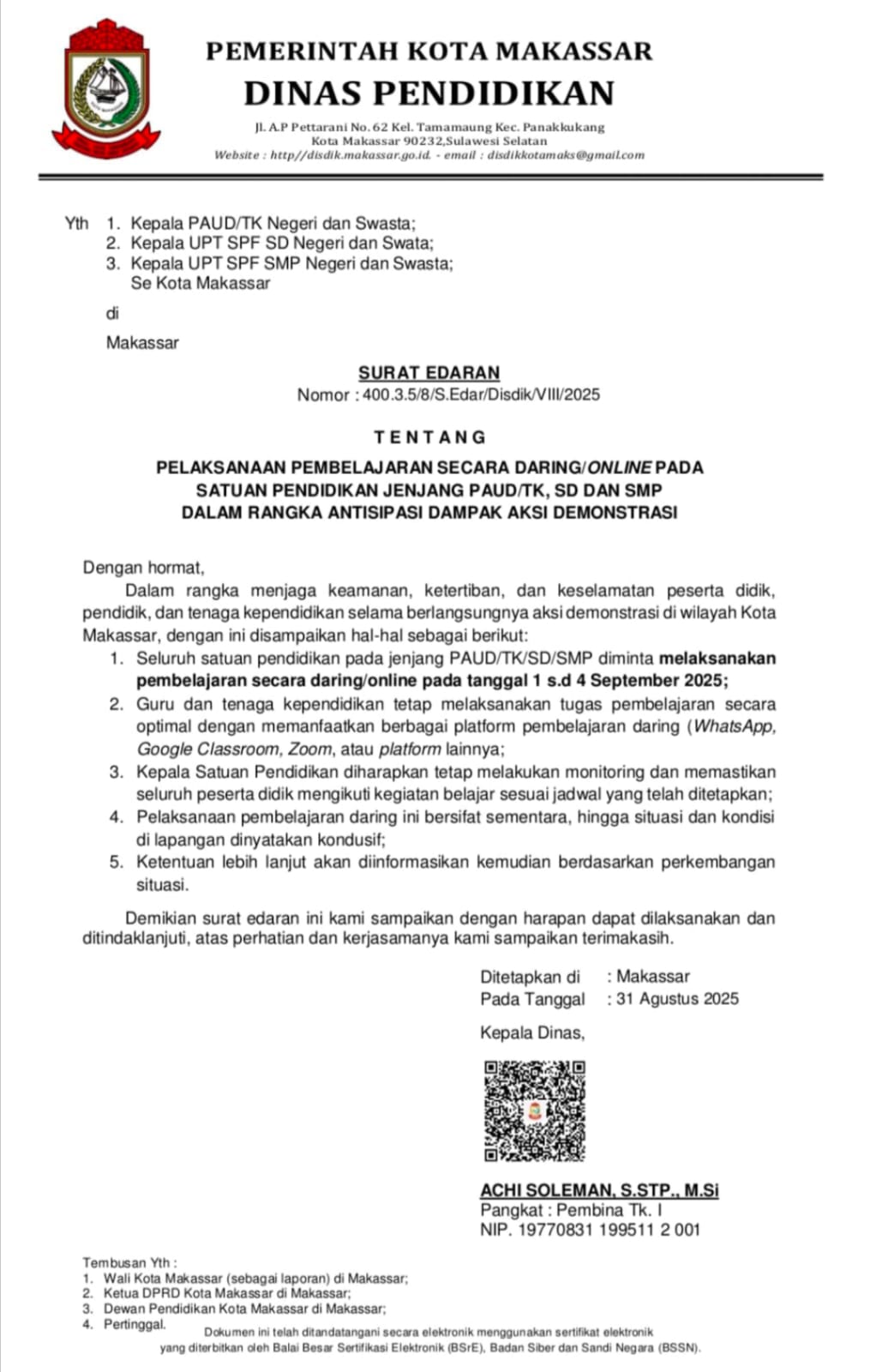 Wali Kota Makassar Munafri Arifuddin, S.H., dalam keterangannya, menegaskan bahwa kebijakan ini bertujuan menjaga keselamatan serta kesehatan siswa, guru, dan tenaga kependidikan. “Keselamatan peserta didik adalah prioritas utama. Oleh karena itu, kami meminta pihak sekolah menyesuaikan metode pembelajaran agar tetap berjalan secara daring,” ujarnya, Minggu (31/8/2025).