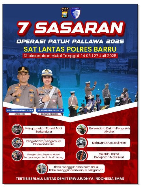 Barru, sulawesi selatan 13 Juli 2025 – Kepolisian Resor (Polres) Barru akan melaksanakan Operasi Patuh 2025 yang berlangsung selama dua pekan, mulai Senin, 14 Juli hingga 27 Juli 2025. Operasi ini bertujuan untuk meningkatkan kesadaran dan kepatuhan masyarakat terhadap aturan lalu lintas, sekaligus menekan angka pelanggaran dan kecelakaan di wilayah hukum Polres Barru.
