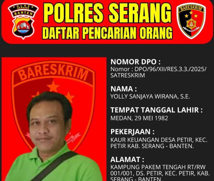Dalam rilis Daftar Pencarian Orang (DPO) nomor : DPO/96/XII/RES.3.3/2025/SATRESKRIM, Atas Nama Yolly Sanjaya Wirana,.S.E,. tempat tanggal lahir Medan, 29 Mei 1982, Pekerjaan Kaur Keuangan Desa Petir, Kecamatan Petir, Kabupaten Serang, Alamat Kampung Pakem tengah Rt/Rw 001/001 Desa/ Kecamatan Petir, Kabupaten Serang.